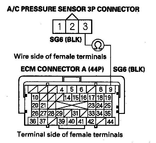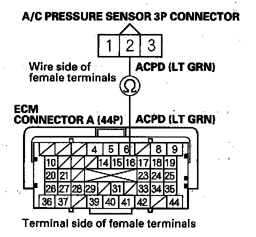 17. Check for continuity between A/C pressure sensor 3P connector terminal No. 2 and ECM connector terminal A16.