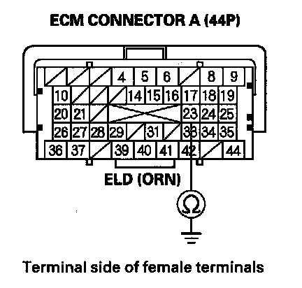 10. Check for continuity between ECM connector terminal A23 and body ground.