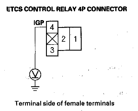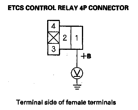 10. Measure voltage between ETCS control relay 4P connector terminal No. 1 and body ground.