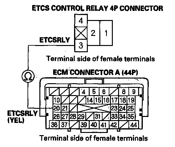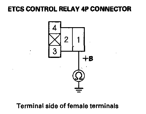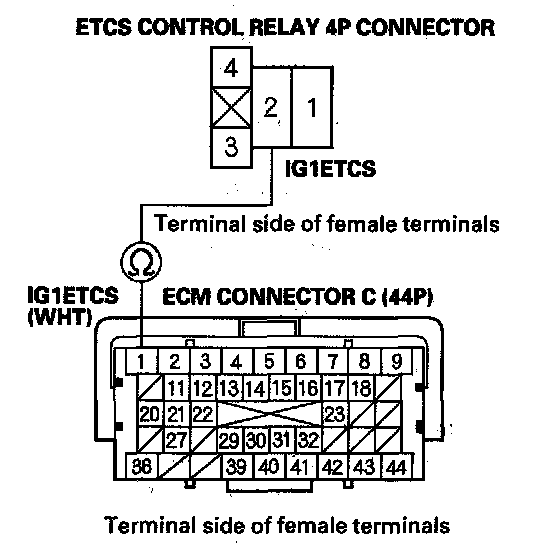 14. Check for continuity between ETCS control relay 4P connector terminal No. 2 and ECM connector terminal C1.