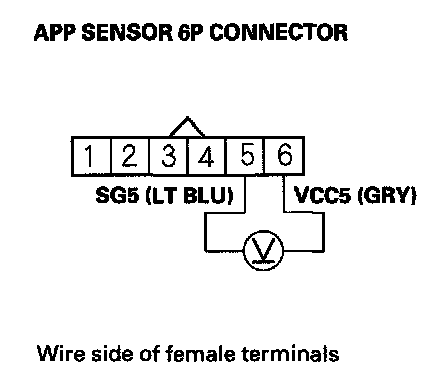 6. Measure voltage between APP sensor 6P connector terminals No. 5 and No. 6.