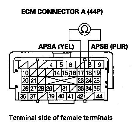 YES - Repair short in the wires between ECM connector terminals A17 (APSA line) and A18 (APSB line), then go to step 14.