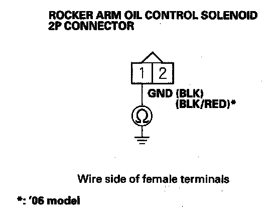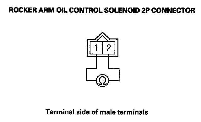 7. At the solenoid side, measure resistance between rocker arm oil control solenoid 2P connector terminals No. 1 and No. 2.