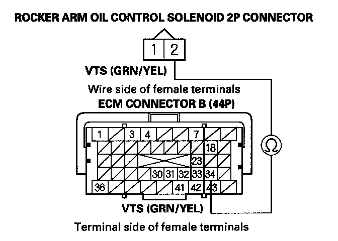11. Check for continuity between ECM connector terminal B34 and rocker arm oil control solenoid 2P connector terminal No. 2.