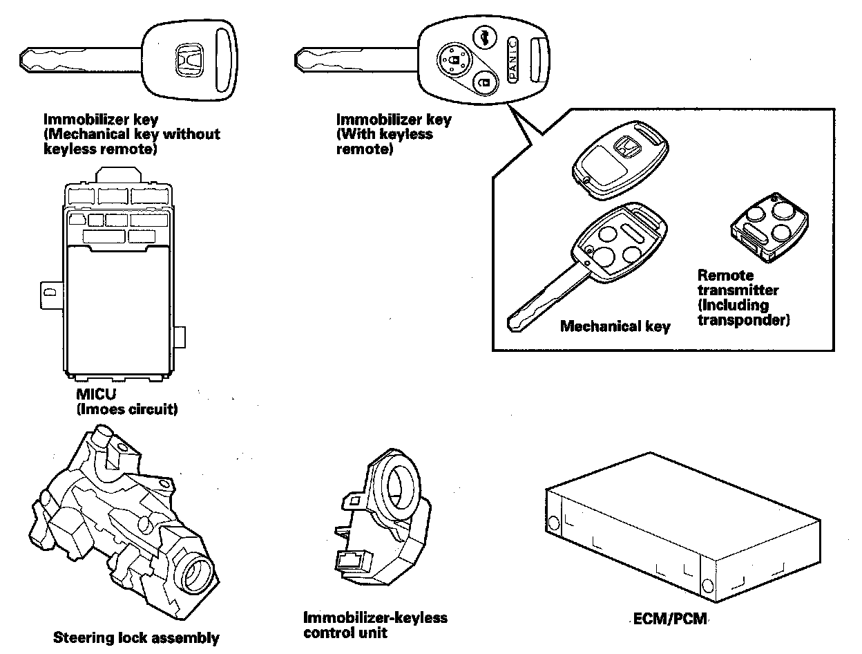 This system consists of a transponder combined with a keyless transmitter, immobilizer-keyless control unit, immobilizer indicator, imoes unit (built into the MICU), and the ECM/PCM. When the immobilizer key (programmed by the HDS) is inserted into the ignition switch and turned to the ON (II) position, the immobilizer-keyless control unit sends power to the transponder in the ignition key. The transponder then sends a coded signal back to the immobilizer-keyless control unit which then sends a coded signal to the ECM/PCM and the MICU (imoes unit). The ECM/PCM and MICU (imoes unit) identify this coded signal, then fuel power is supplied.
