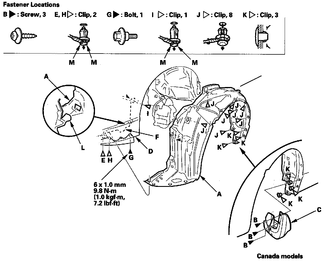 3. From the wheel arch, remove the clips (I, J, K) securing the front inner fender (and splash shield) to the body.