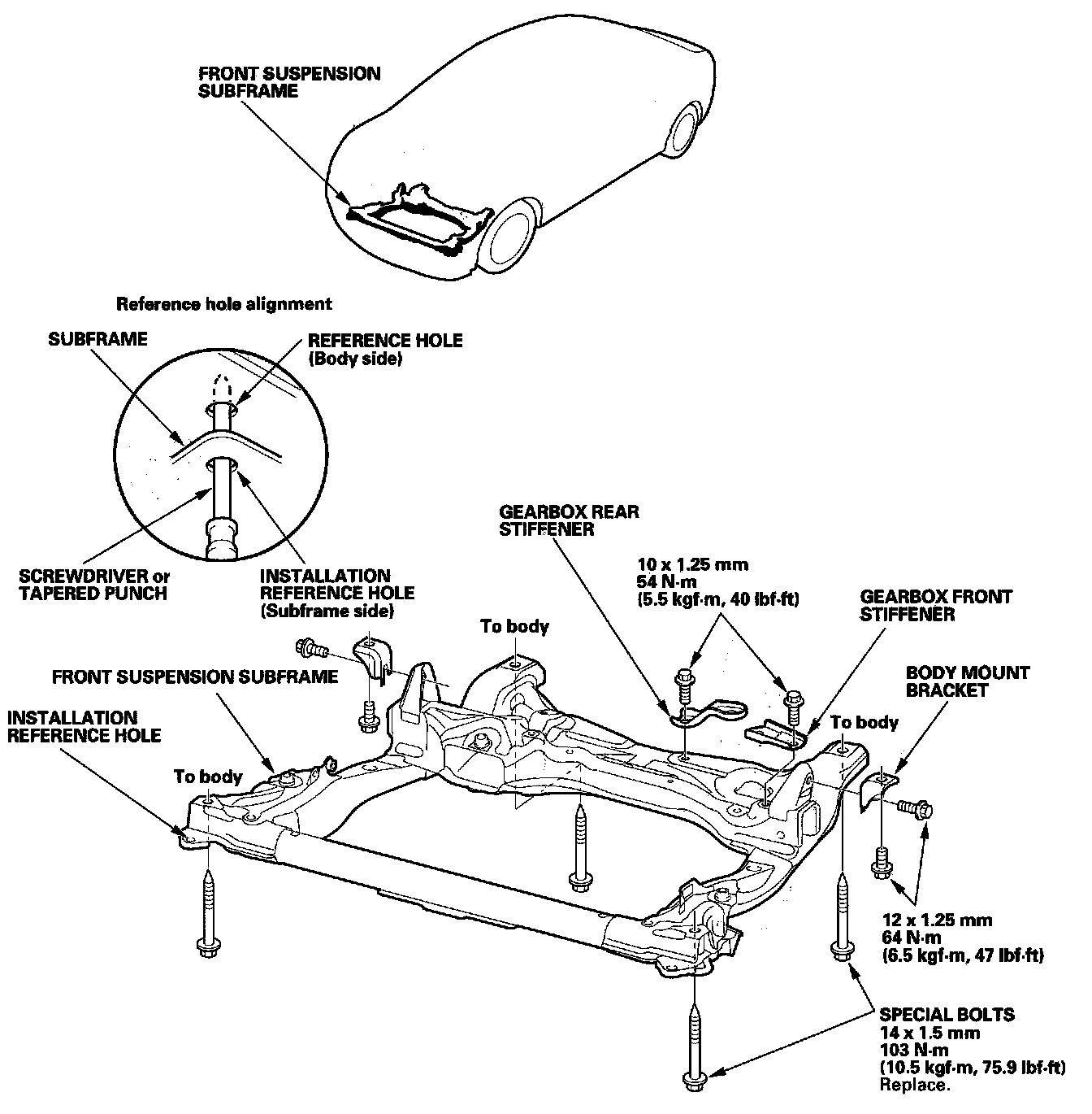 - When installing, align both Installation reference holes in the subframe with both reference holes in the body using a screwdriver or tapered punch as a guide.