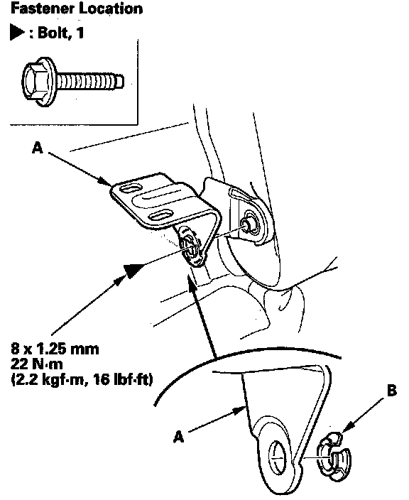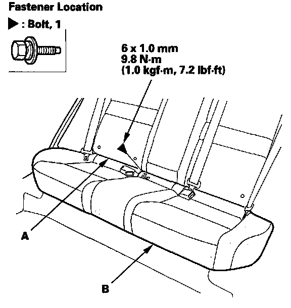 1. Remove the bolt between the seat-back (A) and the seat cushion (B).