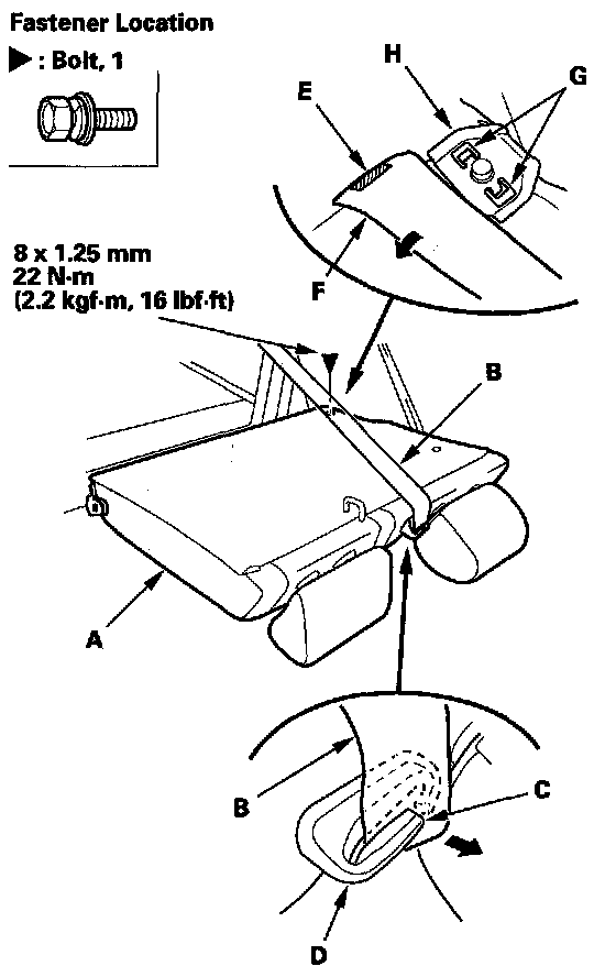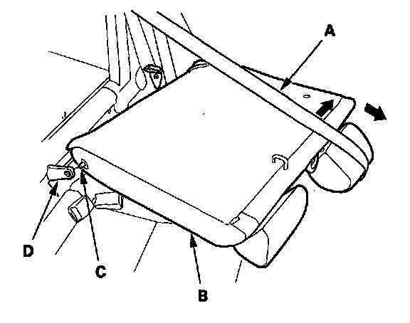 5. Extend the rear center seat belt (A) to remove the left seat-back (B), then release the pivot shaft (C) from the center pivot bracket (D).