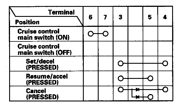- If there is continuity, and it matches the table, but switch failure occurred on the cruise control input test, check and repair the wire harness on the switch circuit.