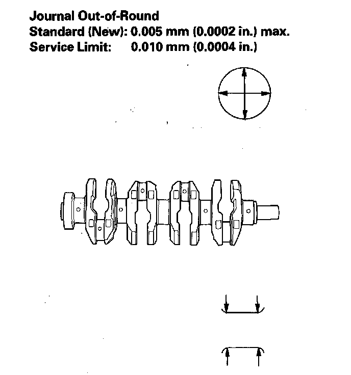 4. Measure the out-of-round at the middle of each rod and main journal in two places. The difference between measurements on each journal must not be more than the service limit.