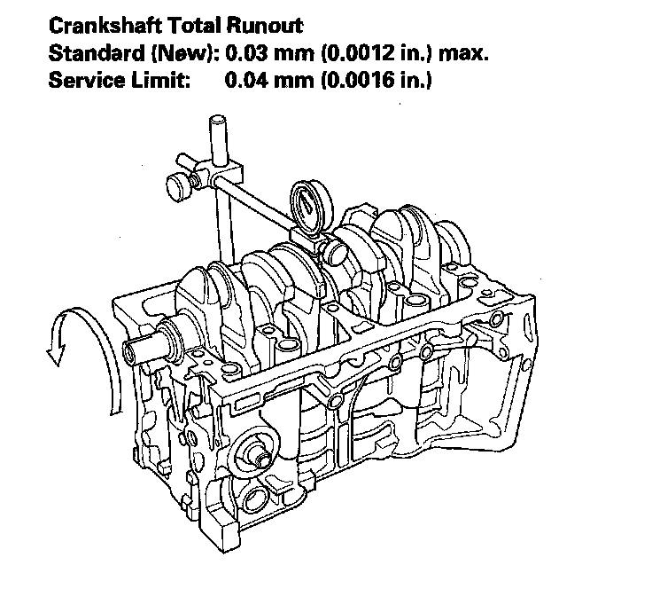 9. Measure runout on all main journals. Rotate the crankshaft two complete revolutions. The difference between measurements on each journal must not be more than the service limit.