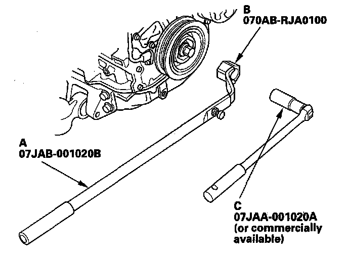 5. Remove the bolt with a 19 mm socket (C) and breaker bar, then remove the crankshaft pulley.