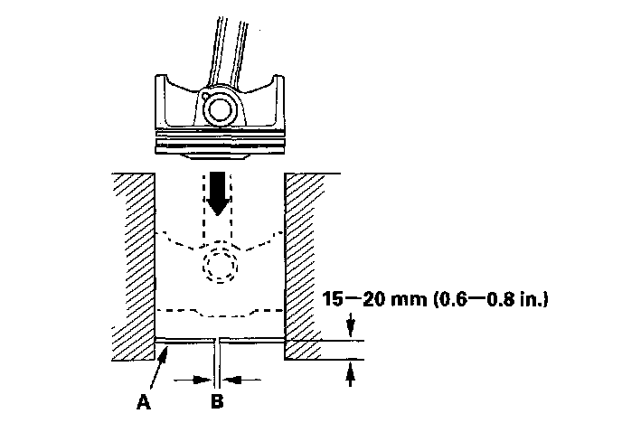 4. Using a piston that has its rings removed, push a new ring (A) into the cylinder bore 15 - 20 mm (0.6 - 0.8 in.) from the bottom.