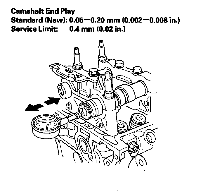 4. Zero the dial indicator against the end of the camshaft, then push the camshaft back and forth and read the end play. If the end play is beyond the service limit, replace the cylinder head and recheck. If it is still beyond the service limit, replace the camshaft.