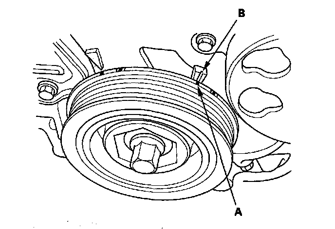 1. Turn the crankshaft pulley so its top dead center (TDC) mark (A) lines up with the pointer (B).