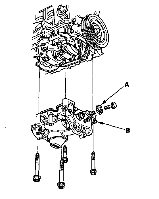 6. Remove the oil pump sprocket (A), then remove the oil pump (B).