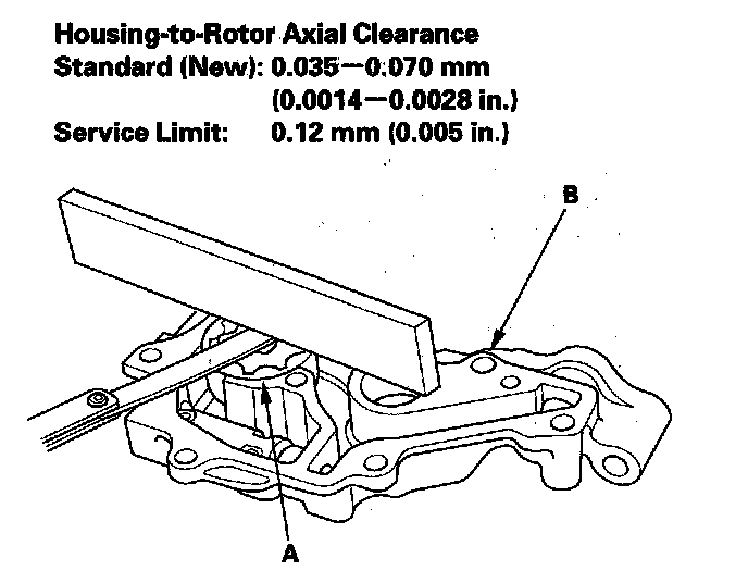 3. Check the housing-to-rotor axial clearance between the rotor (A) and pump housing (B). If the housing-to-rotor axial clearance exceeds the service limit, replace the oil pump.