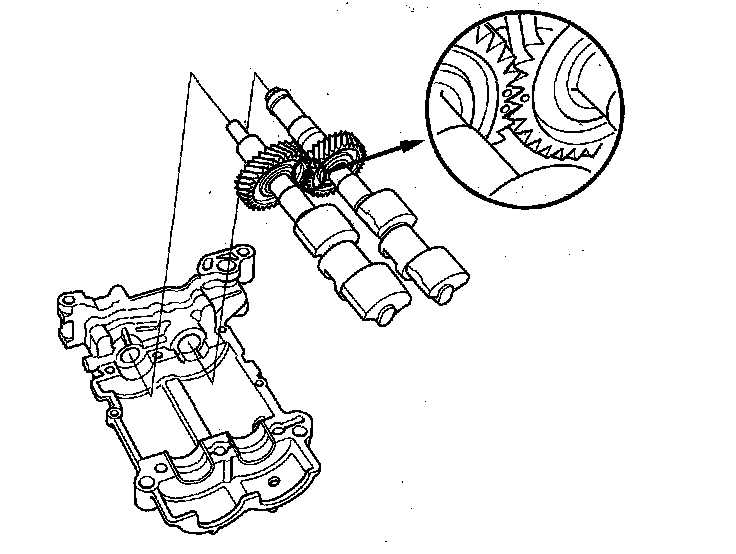10. Align the punch mark on the rear balancer shaft in the center of the two punch marks on the front balancer shaft, then install the balancer shafts on the lower balancer shaft holder.