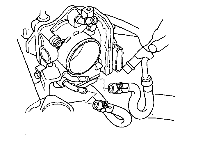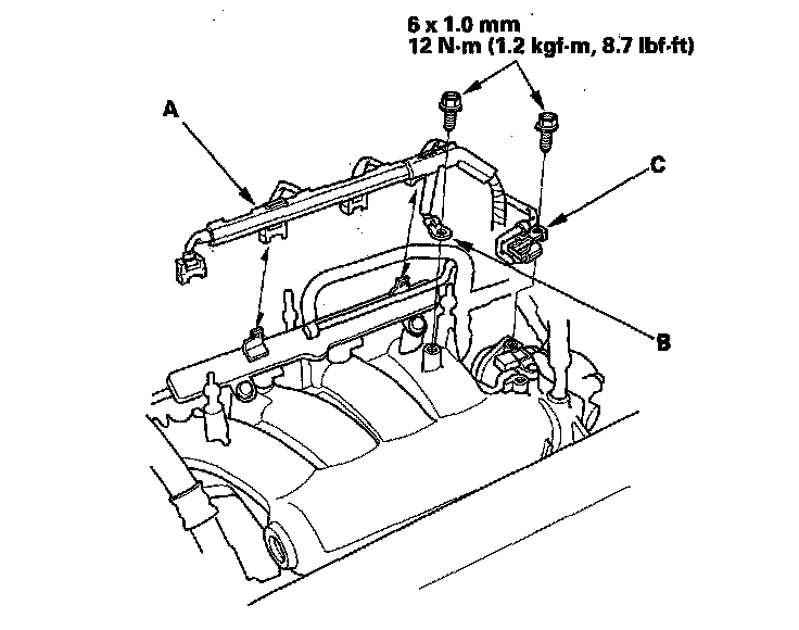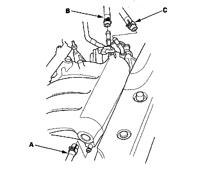 7. Install the positive crankcase ventilation (PCV) hose (A), evaporative emission (EVAP) canister hose (B) and brake booster vacuum hose (C).