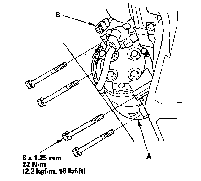 24. Install the A/C compressor (A), then connect the A/C compressor clutch connector (B).