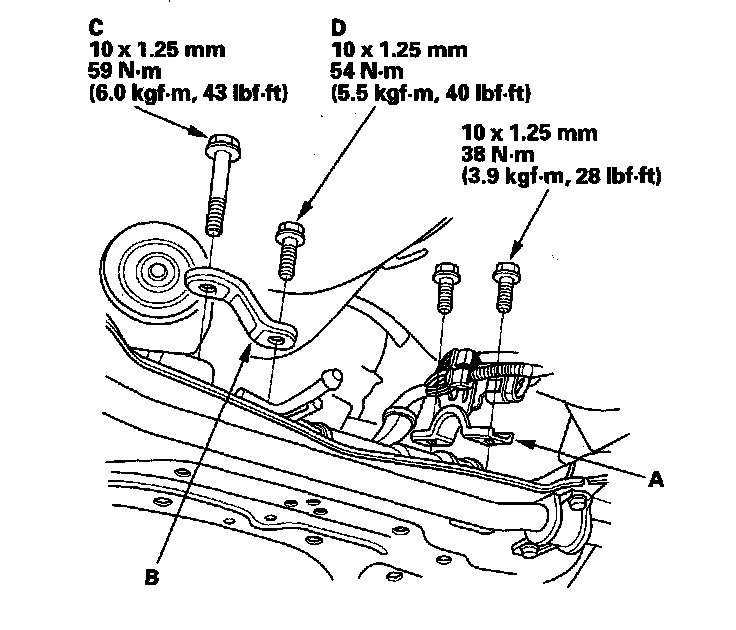28. Install the stiffener (B), then tighten the steering gearbox mounting bolt (C) and stiffener mounting bolt (D).