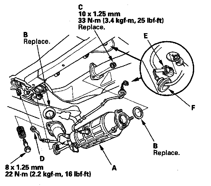 34. Connect the secondary heated oxygen sensor (secondary H02S) connector (E), then install the grommet (F).