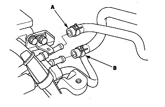 45. Install the evaporative emission (EVAP) canister hose (A) and brake booster vacuum hose (B).