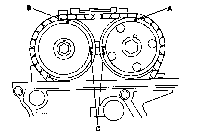 6. Set the No. 1 piston at top dead center (TDC). The punch mark (A) on the variable valve timing control (VTC) actuator and the punch mark (B) on the exhaust camshaft sprocket should be at the top. Align the TDC marks (C) on the VTC actuator and exhaust camshaft sprocket.