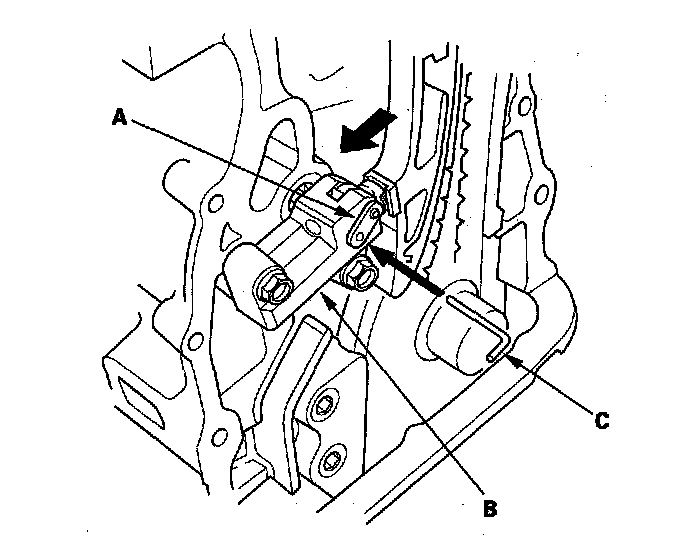 18. Align the holes on the lock (A) and the auto-tensioner (B), then insert a 1.2 mm (0.05 in.) diameter pin or lock pin (P/N 14511-PNA-003) (C) into the holes. Turn the crankshaft clockwise to secure the pin.