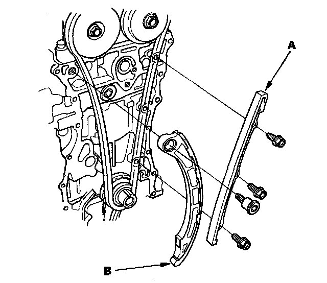 8. Disconnect the crankshaft position (CKP) sensor connector (A) and VTC oil control solenoid valve connector (B).