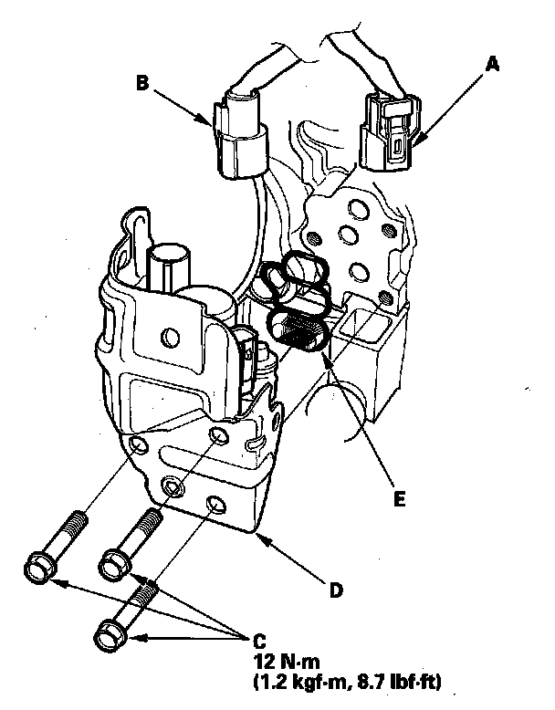 5. Install the parts in the reverse order of removal with a new rocker arm oil control valve filter (E).