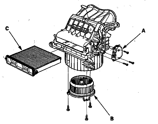 - The recirculation control motor (A), blower motor (B) and the dust arid pollen filter (C) can be replaced without removing the blower unit.