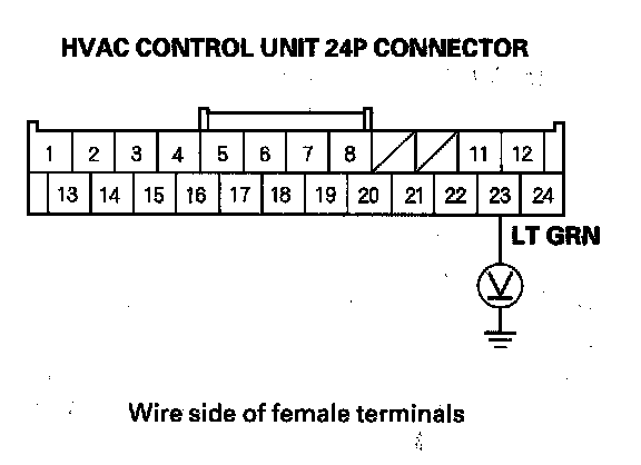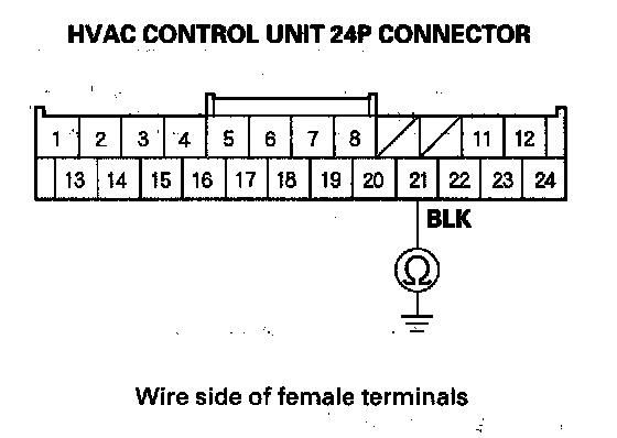 6. Check for continuity between the HVAC control unit 24P connector No. 21 terminal and body ground.