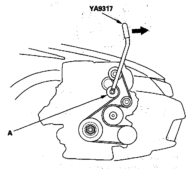1. Move the auto-tensioner (A) using the belt tension release tool to relieve tension from the drive belt, then remove the drive belt.