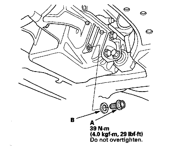 3. Reinstall the drain bolt with a new washer (B).