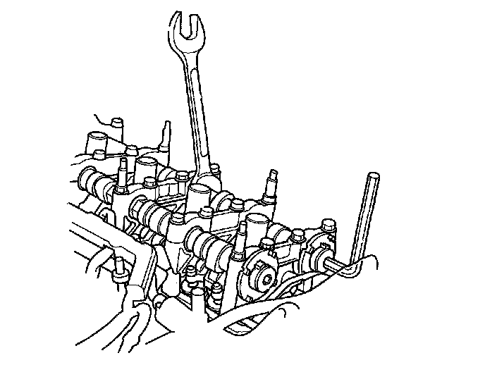 3. Hold the exhaust camshaft with a 27 mm open-end wrench, then loosen the bolt.