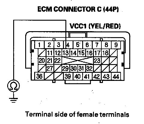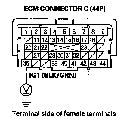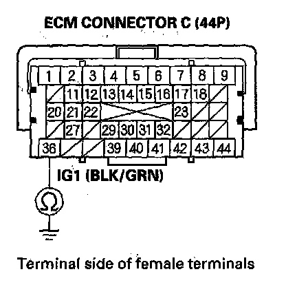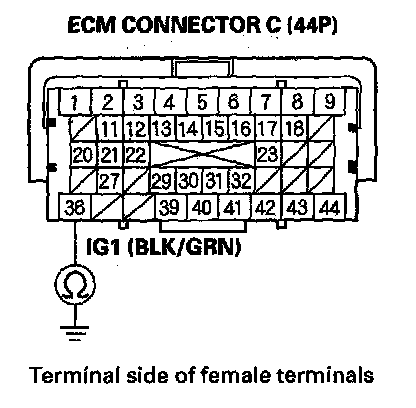 77. Check for continuity between body ground and ECM connector terminals B1, B36, C2, C40, and C44 individually.