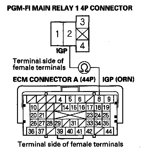 48. Check for continuity between PGM-FI main relay 1 4P connector terminal No. 2 and body ground.