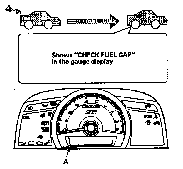 The first time a leak is detected a "CHECK FUEL CAP" message appears in the gauge display (A). To scroll to another message, press the select/reset button. The "CHECK FUEL CAP" message will appear each time you restart the engine until the system turns the message off. Turn the engine off then replace or tighten the fuel fill cap until clicks at least once.