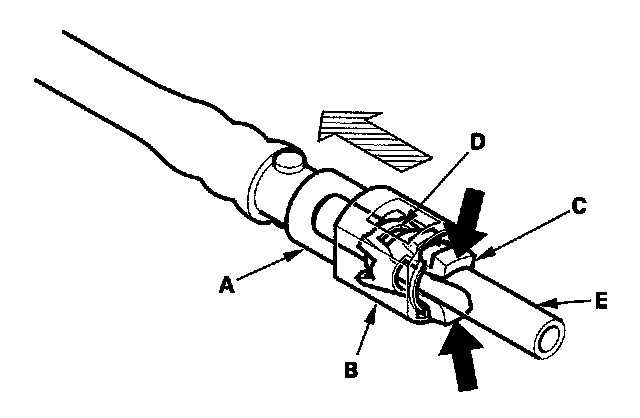 11. Disconnect the quick-connect fitting (A): Hold the connector (B) with one hand, and squeeze the retainer tabs (C) with the other hand to release them from the locking tabs (D). Pull the connector off.