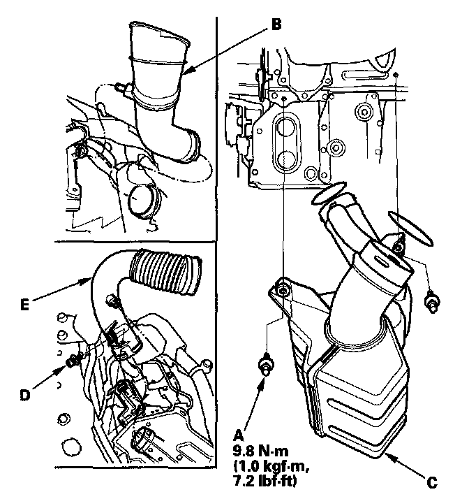 6. Remove the bolt (D), and duct (E).