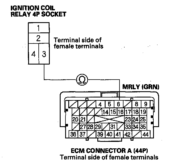 NO - Repair open in the wire between ignition coil relay 4P socket terminal No. 3 and the ECM (A6).