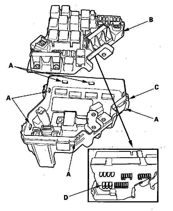 5. Turn the housing over again. Using two flat-tip screwdrivers, release the tabs (A), and pry up the fuse/relay box base (B) from the fuse/relay box housing (C).