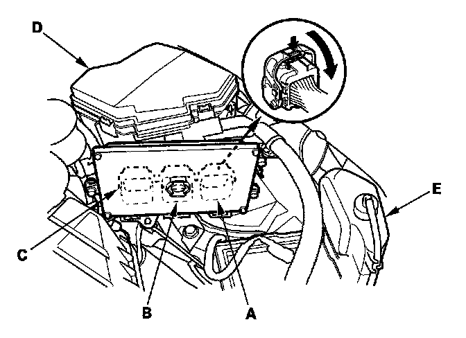 3. Lift up the under-hood fuse/relay box (D) and remove the coolant reservoir (E).