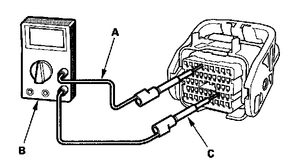 6. Connect one side of the patch cord (A) terminals to a commercially available digital multimeter (B), and connect the other side of the patch cord terminals to a commercially available banana jack (Pomona Electronics Tool No. 3563 or equivalent) (C).
