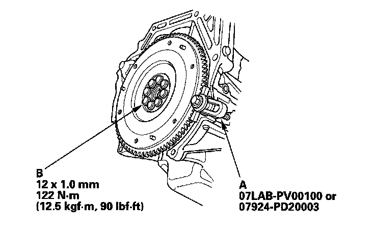 Torque the flywheel mounting bolts (B) in a crisscross pattern in several steps.