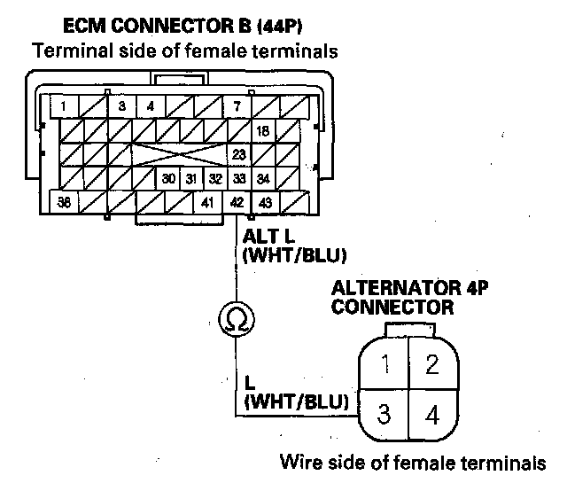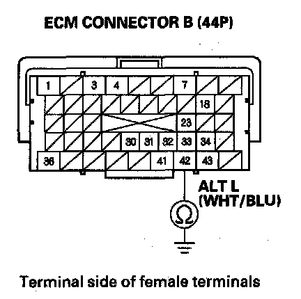 25. Check for continuity between ECM connector terminal B42 and alternator 4P connector terminal No. 3.