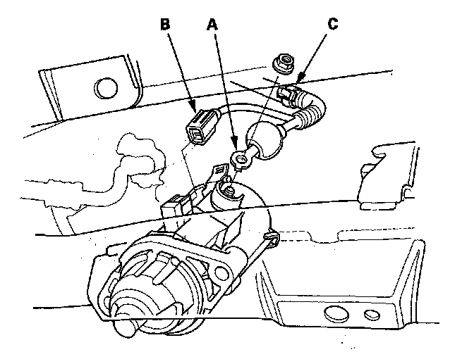 7. Remove the harness clamp (C), then remove the starter.