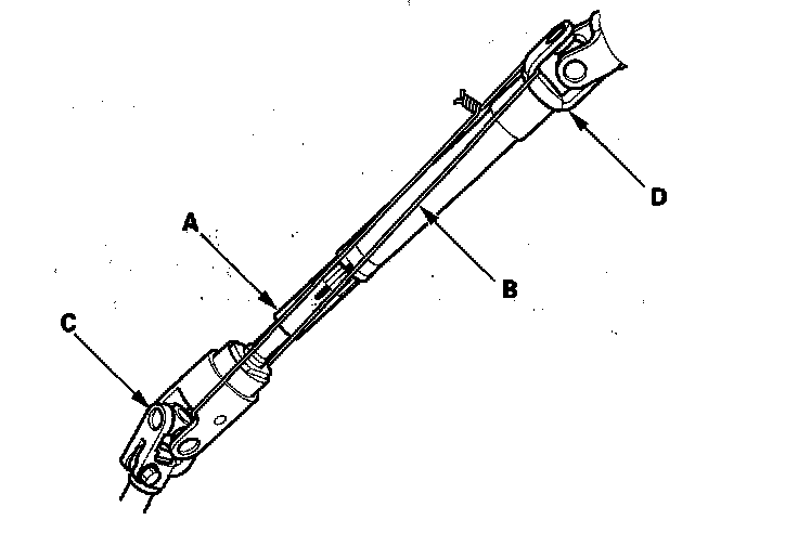 9. Hold the lower slide shaft (A) on the column with a piece of wire (B) between the joint yoke (C) of the lower slide shaft and joint yoke (D) of the upper shaft to prevent the slider shaft from pulling out.